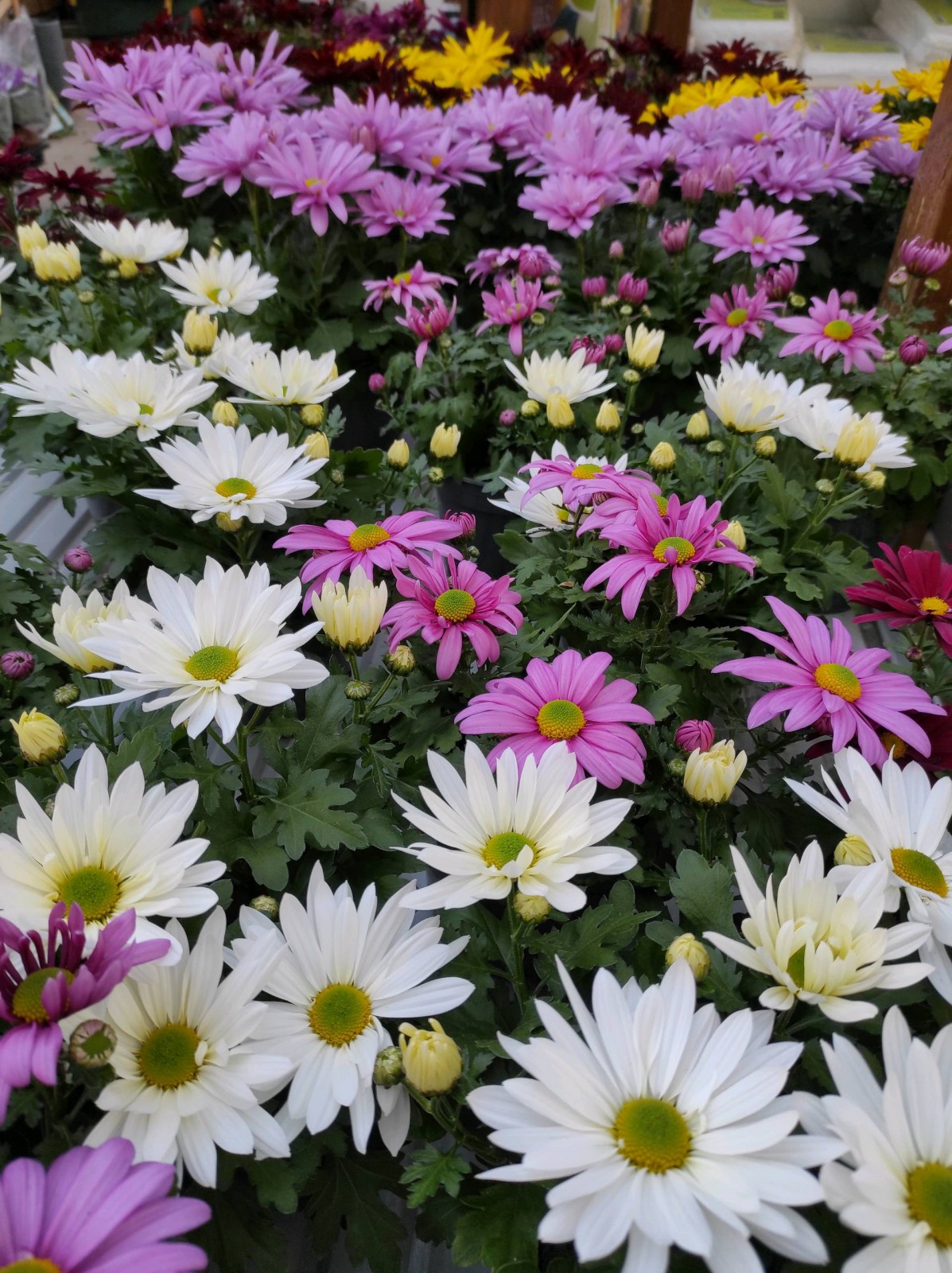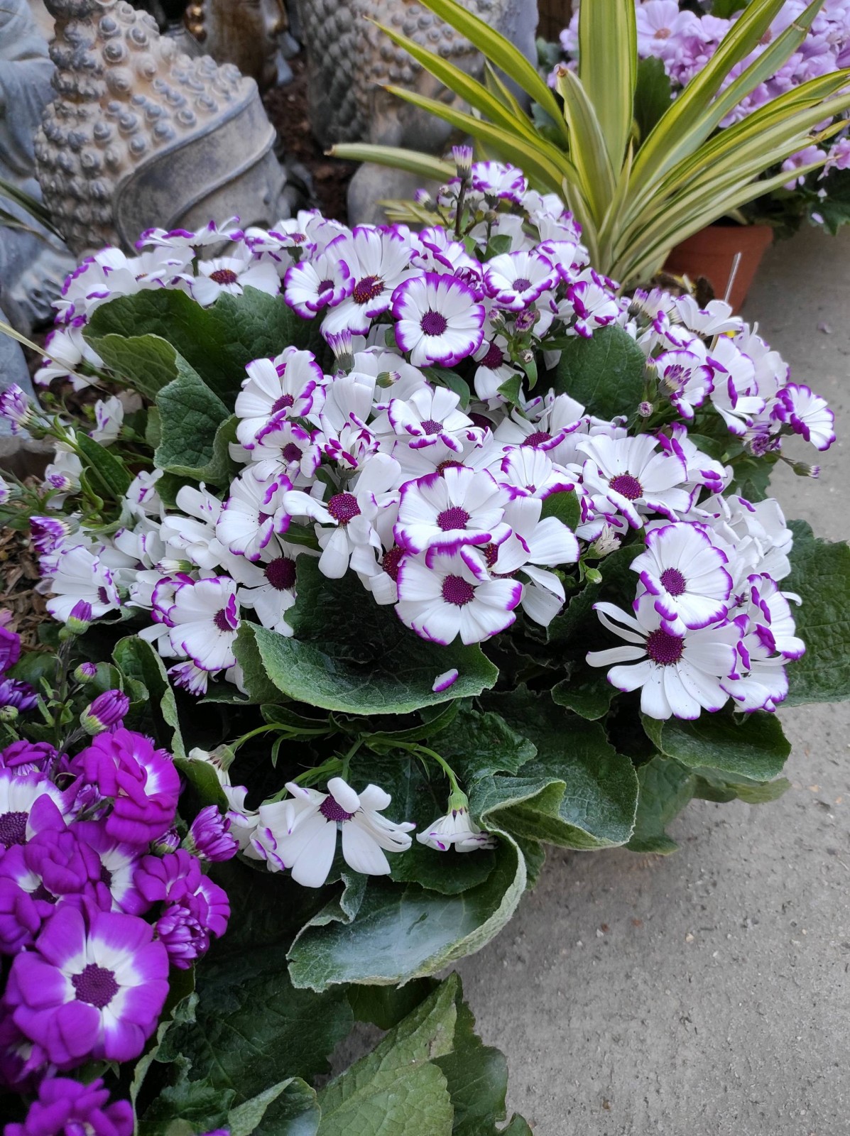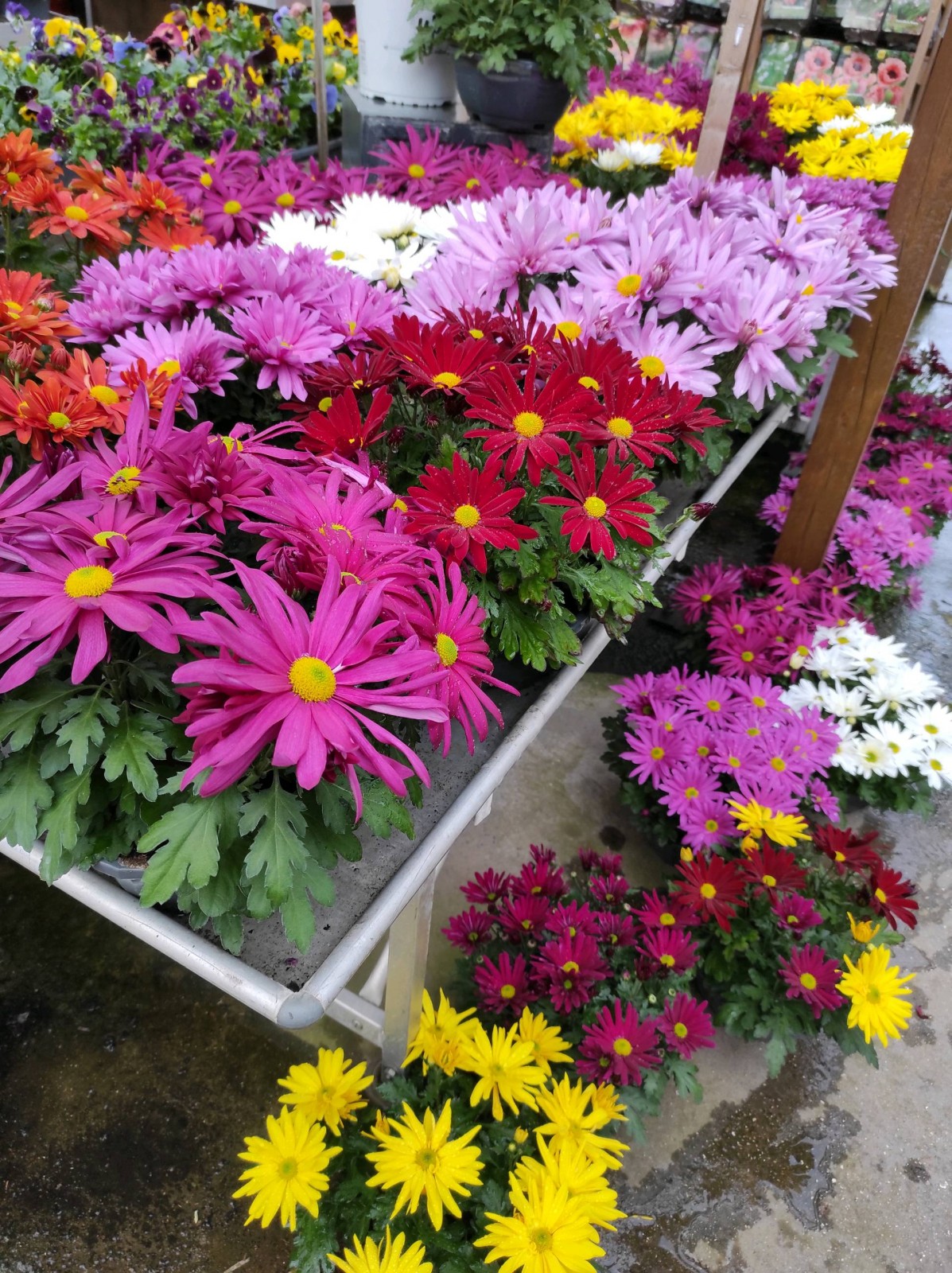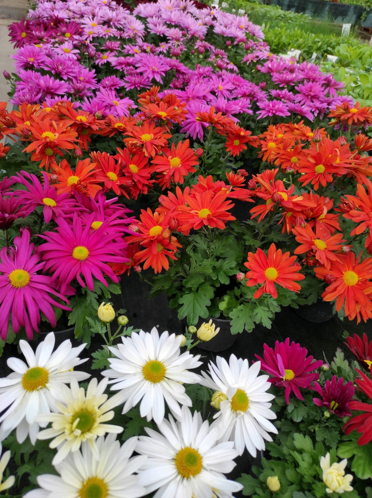 Les cinéraires aux magnifiques couleurs, des chrysanthèmes en pot, en jardinière ou en coupe ainsi que les Kalanchoë en coupe ou en pot.
